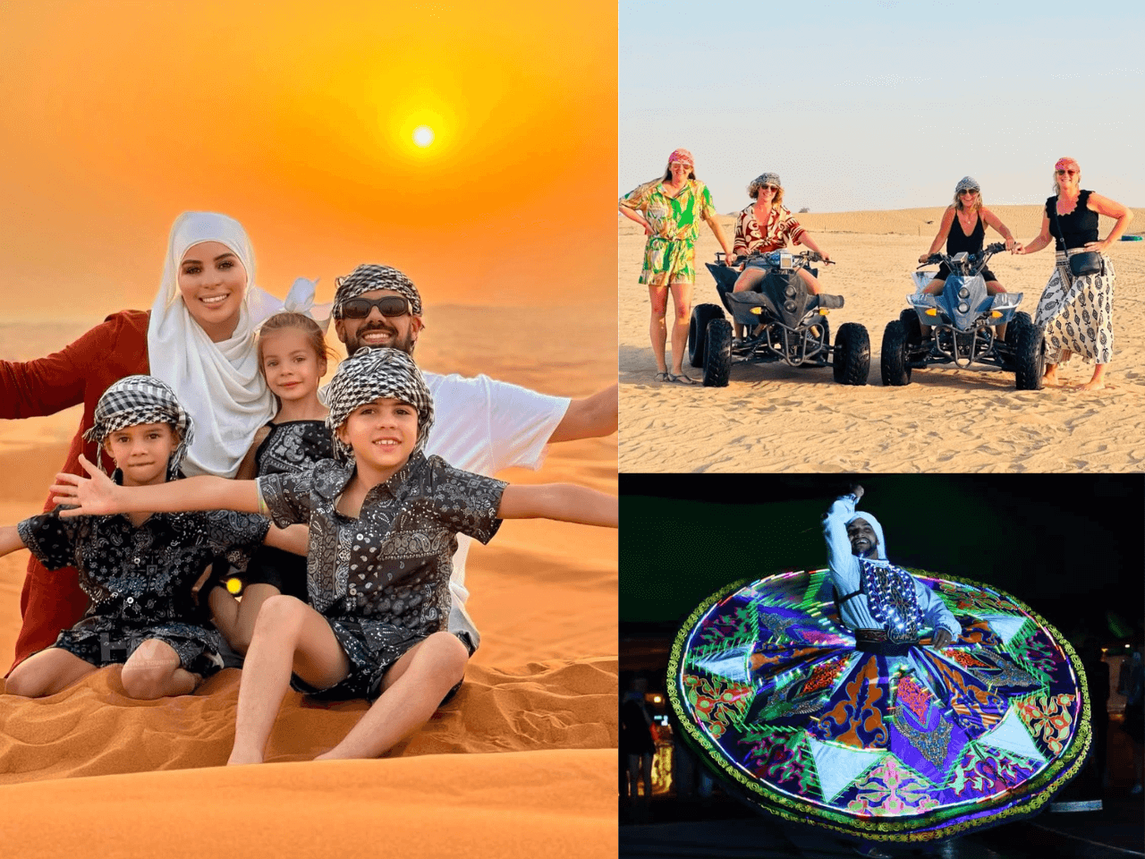 As night falls, indulge in a delicious BBQ buffet dinner with vegetarian and non-vegetarian options, along with unlimited soft drinks. The evening is made even more special with captivating live performances — including the vibrant Tanoura dance, mesmerizing belly dance, and an incredible fire show. Before heading back, capture group photos with your friends and family to cherish the memories of your best Desert Safari in Abu Dhabi.