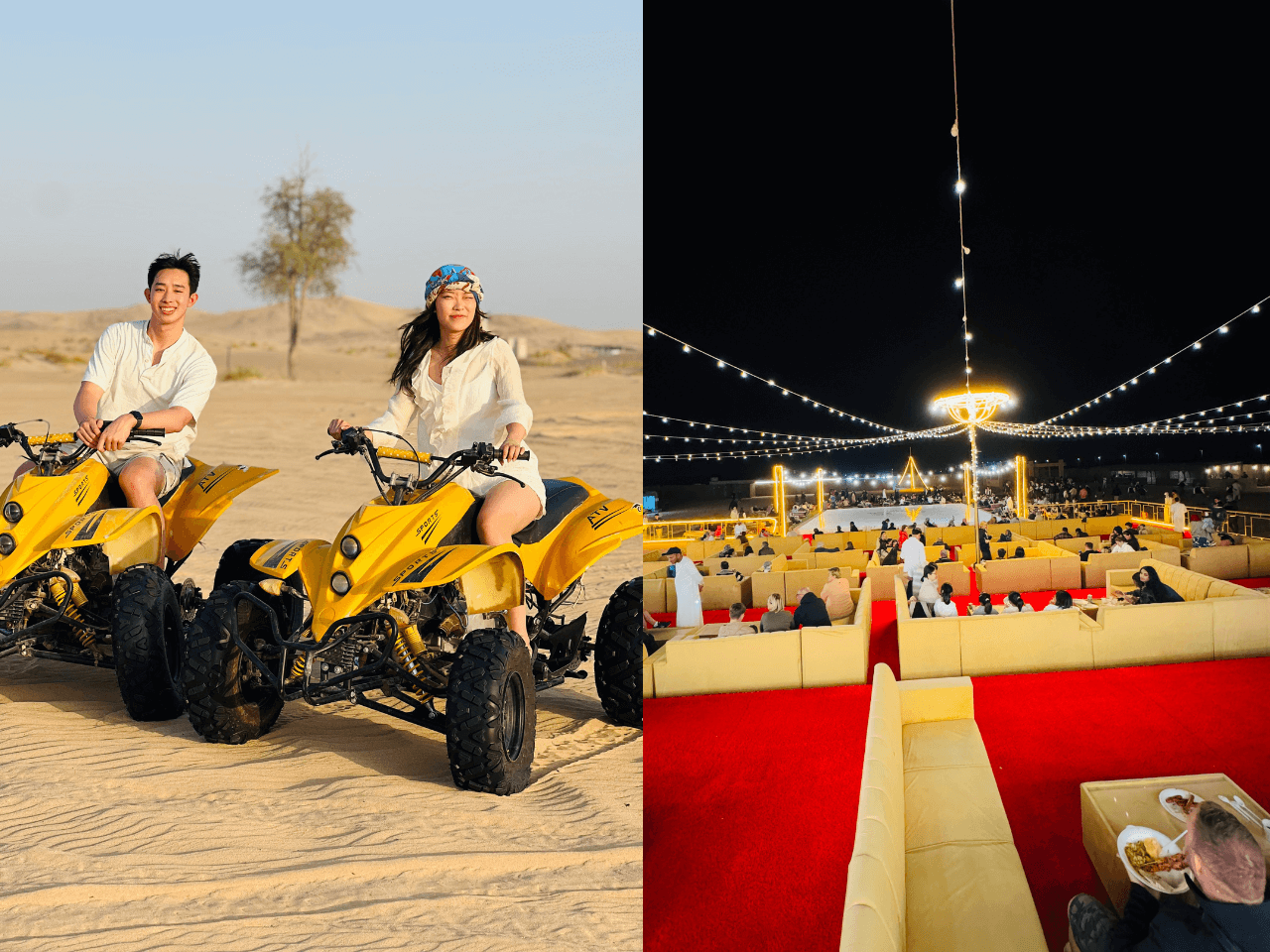 After dune bashing, we’ll stop for refreshments and give you the chance to witness a magical desert sunset — the perfect moment for stunning photos. We then head to our traditional Bedouin-style desert camp, where more cultural and fun activities await. Ride a camel, the “Ship of the Desert,” try sandboarding, and dress up in traditional Arabic attire for memorable photos. Ladies can enjoy elegant henna designs from our skilled henna artist.